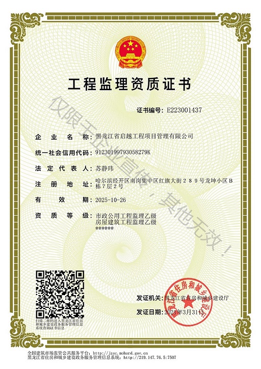 黑龍江省啟越項目咨詢集團有限公司,成立于2006年10月17日,具有中華人民共和國住房和城鄉建設部頒發的工程招標代理機構甲級資質、工程造價咨詢企業甲級資質;黑龍江省住房和城鄉建設廳頒發的房屋建筑工程監理資質及市政公用工程監理資質;黑龍江省司法廳頒布的司法鑒定許可證;中國政府采購網登記注冊的政府采購代理機構。我公司是專業從事工程類招標代理服務、政府采購項目類招標代理服務、工程造價咨詢服務、工程造價司法鑒定服務、工程監理服務及建設項目全過程跟蹤管理的工程技術服務咨詢企業。